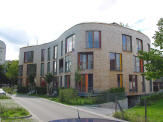 Marie-Curie Str. Nr. 3 ist das 2. Gebäude auf der linken Seite. Es ist ein Neubau mit heller Holzschindelfassade, heißt Amöbe und fällt durch seine gerundete Form auf.